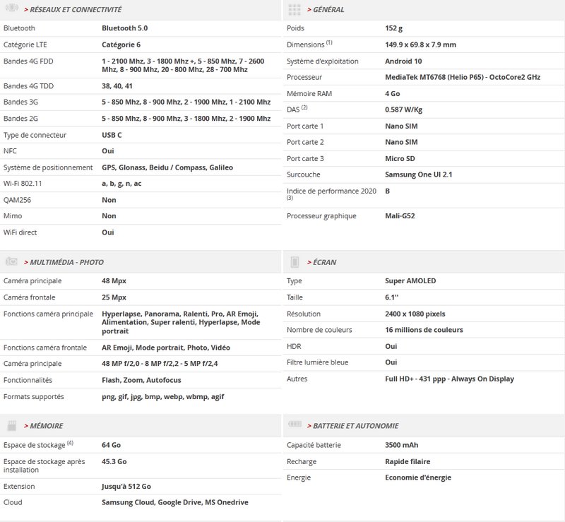 Le Samsung Galaxy A41 s’équipe d’un chipset Helio P65 avec son processeur octa-core 2,0 GHz associé à 4 Go de RAM, d’une batterie 3 500 mAh rechargeable en 15 Watts, d’un écran Super AMOLED 6,1 pouces FHD+ (2 400 x 1 080 pixels), d’un stockage 64 Go extensible de 512 Go par MicroSD, d’un triple capteur photo 48 + 8 + 5 Mégapixels à l’arrière (principal + ultra grand-angle + infos de profondeur du mode portrait) et d’un capteur photo 25 Mégapixels à l’avant dans une encoche. Il est par ailleurs doté du mini-jack et compatible avec la 4G 700 MHz (B28) chère à l’opérateur de Xavier Niel. Samsung fournit un système Android 10 coiffé de l’interface One UI.