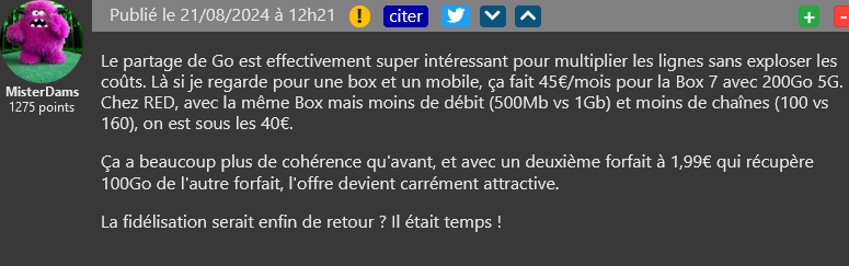 Frappée par une fuite massive d’abonnés, la filiale d’Altice continue son opération reconquête en lançant son programme “SFR Multi” afin de permettre notamment à ses abonnés partager leurs gigas avec leurs proches. “Ainsi, avec une box SFR au sein du foyer, les abonnés peuvent bénéficier du partage de gigas jusqu’à 100Go/mois sur les lignes des proches, de remises sur le mobile jusqu’à 20€/mois sur 4 lignes mobile et de remises jusqu’à 5€ par mois sur l’offre « Maison Sécurisée »“, précise l’opérateur. Une proposition qui intrigue et a clairement attiré l’attention de certains internautes.