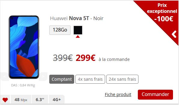 Le Huawei Nova 5T est proposé 299 € au lieu de 399€ pour un achat au comptant. Vous pouvez également vous le procurer en 4 fois sans frais, comptez 77€ à la commande, puis 3 fois 74€ sans frais. Il est également possible de l’acheter en 24 fois sans frais, pour une première commande de 107€ puis 24 fois 8€ sans frais.