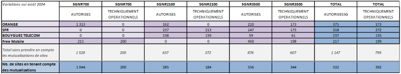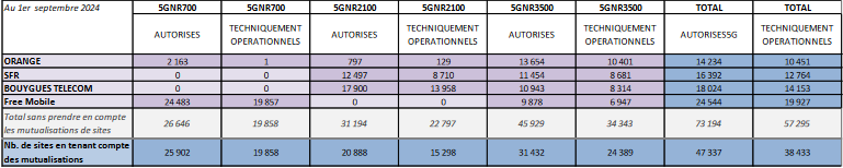 Ainsi, pour respecter son engagement, Free doit encore déployer 1053 sites sur les mois de septembre, octobre, novembre et décembre. Soit environ 263 sites par mois, un rythme très soutenu. Au 1er septembre, 38 945 sites 5G sont déclarés techniquement opérationnels par les opérateurs de téléphonie mobile. La quasi-totalité de ces implantations 5G sont autorisées sur des sites existants, déjà utilisés par les technologies 2G, 3G ou 4G. Seuls 11 sites n’hébergent que de la 5G.