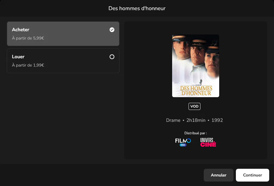 Lors de votre commande, vous vous verrez proposer les autres services qui distribuent ce film, les différentes offres si elles existent (HD, SD…) et il vous faudra saisir votre code d’achat déterminé au préalable sur votre box.