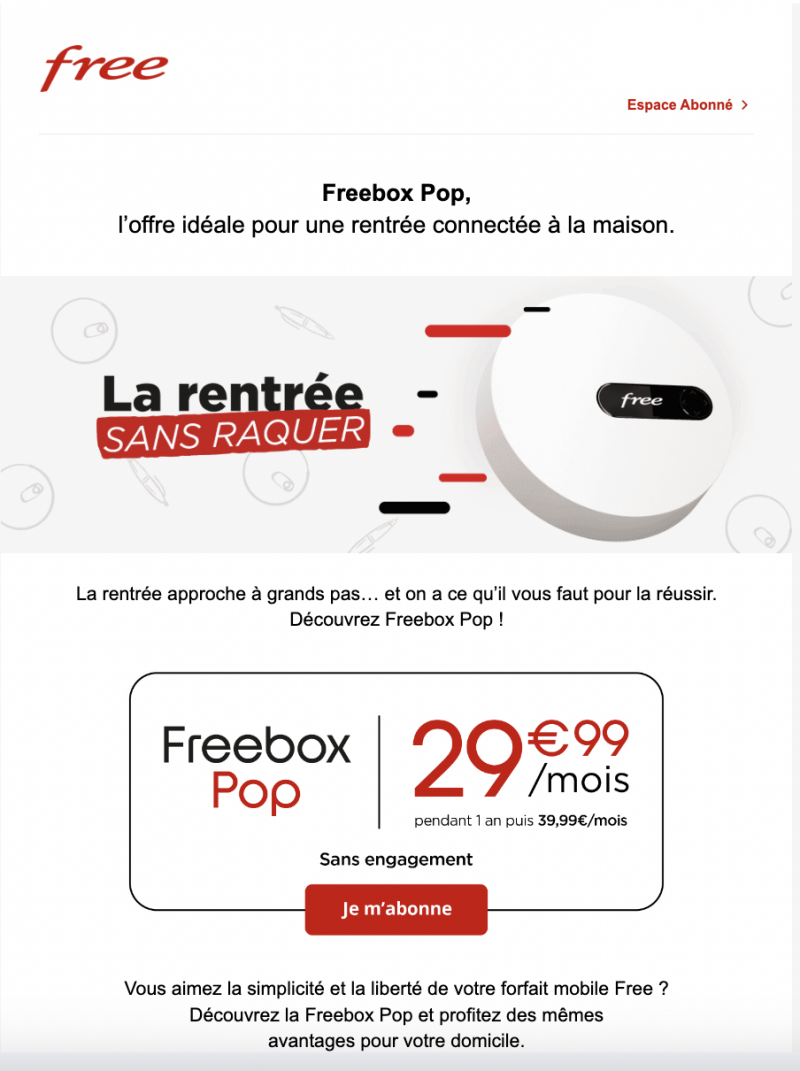 Dans le même temps, l’opérateur envoie également un mail afin de proposer la Freebox Pop avec un tarif de 29,99€/mois pendant 1 ans, puis 39,99€/mois, sans engagement également. Le forfait 5G Illimité passera alors à 9,99€/mois.