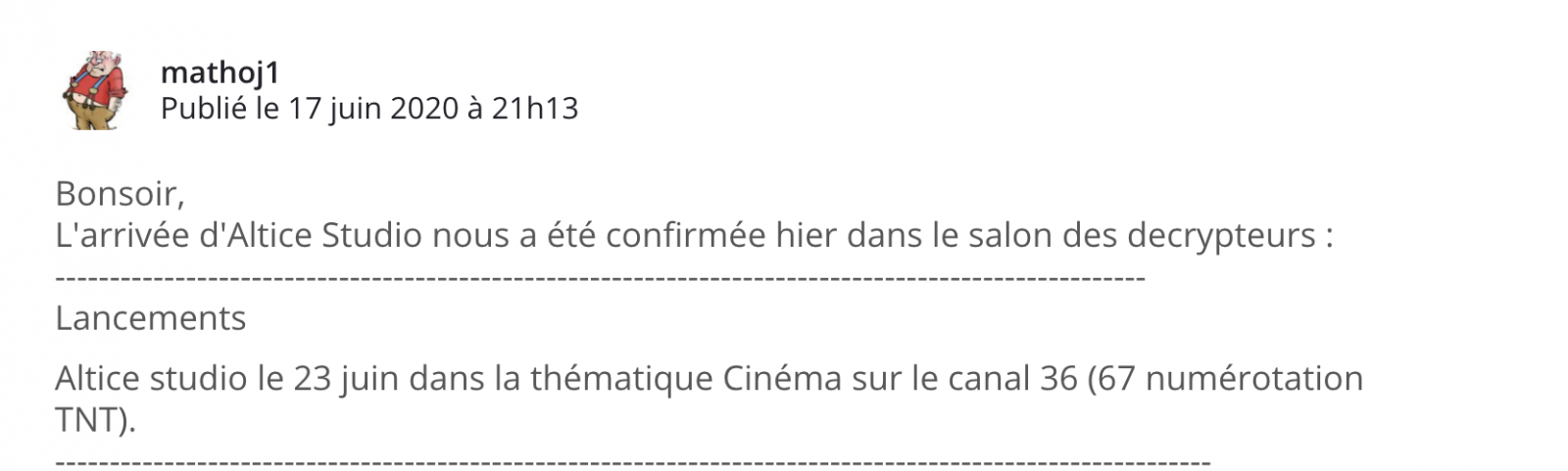 Après une apparition fin mars dans le guide Canal+ sur le cube satellite de Canal+, l’arrivée d’Altice Studio se précise. Son lancement dans les offres de la filiale de Vivendi été confirmé hier lors du salon des décrypteurs du groupe, peut-on lire dans un post sur le forum de l’assistance Canal.