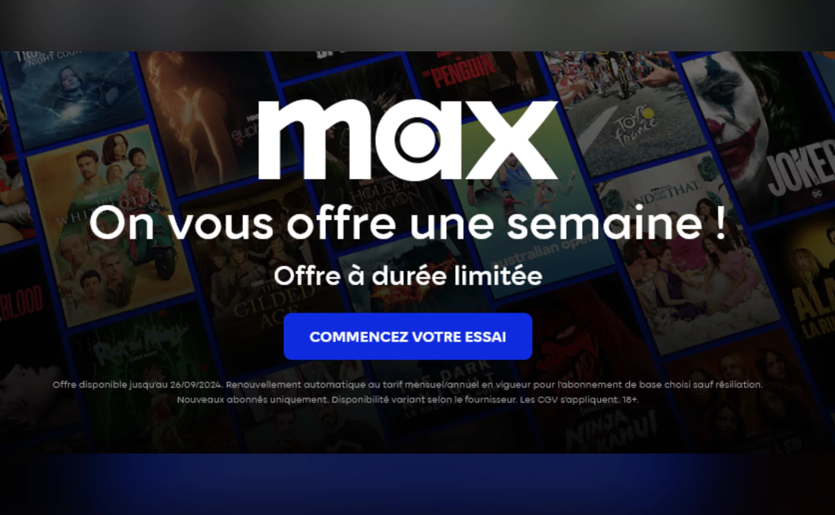 Lancé le 11 juin dernier dans l’Hexagone, Max est aujourd’hui distribué sur de nombreux supports comme les box des opérateurs, les TV connectées, Apple TV , mobiles. La plateforme du groupe Warner Bros. Discovery intègre jusqu’au 26 septembre prochain, une période d’essai gratuite pendant une semaine pour les nouveaux abonnés uniquement. Cela concerne toute souscription à l’un de ses trois forfaits, Basic avec pub à 5,99€/mois ( 2 écrans, Full HD), Standard à 9,99€/mois (2 écrans, Full HD, 30 téléchargements et chaînes incluses) et Premium (4K UHD, Dolby Atmos, 100 téléchargements, 4 appareils et chaînes supplémentaires) à 13,99€/mois. C’est occasion de découvrir des films et séries à succès comme House of the Dragons, The Last of Us, The Pinguin (dès le 20 septembre) mais aussi les univers d’Harry Potter, HBO, DC et Discovery.