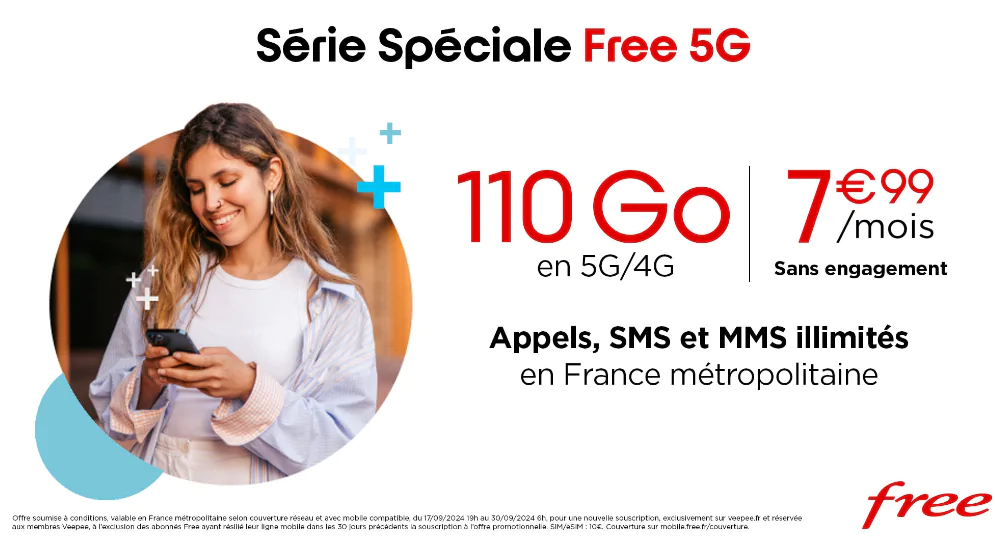 Offre soumise à conditions, valable en France métropolitaine selon couverture réseau et avec un mobile compatible, réservée aux membres Veepee, à l’exclusion des abonnés Free ayant résilié leur ligne mobile dans les 30 jours précédents la souscription à l’offre promotionnelle. Valable du 17/09/2024 19h au 30/09/2024 6h, pour une nouvelle souscription, exclusivement sur veepee.fr.