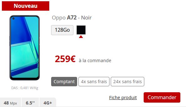 Le Oppo A72 est disponible, avec 128 Go de stockage, dans son coloris noir pour 259€ au comptant. Il est également possible de se le procurer en 4 fois sans frais, pour 67€ puis trois fois 64€. Et pour échelonner le paiement sur plus longtemps, vous pouvez opter pour le payer avec une première commande de 67€ puis 24 versements de 8€.