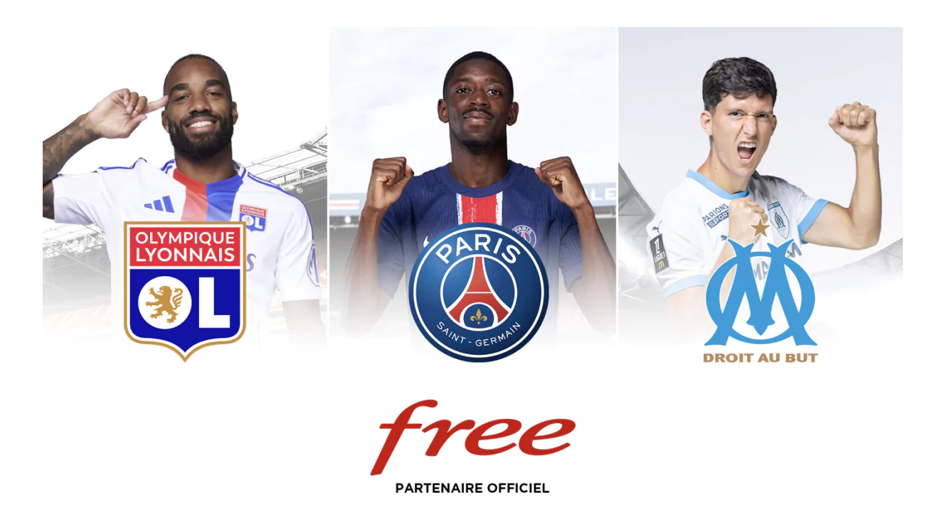 Ce 20 septembre, Free annonce devenir partenaire officiel de trois clubs légendaires du football français : le Paris Saint-Germain, l’Olympique de Marseille, et l’Olympique Lyonnais.