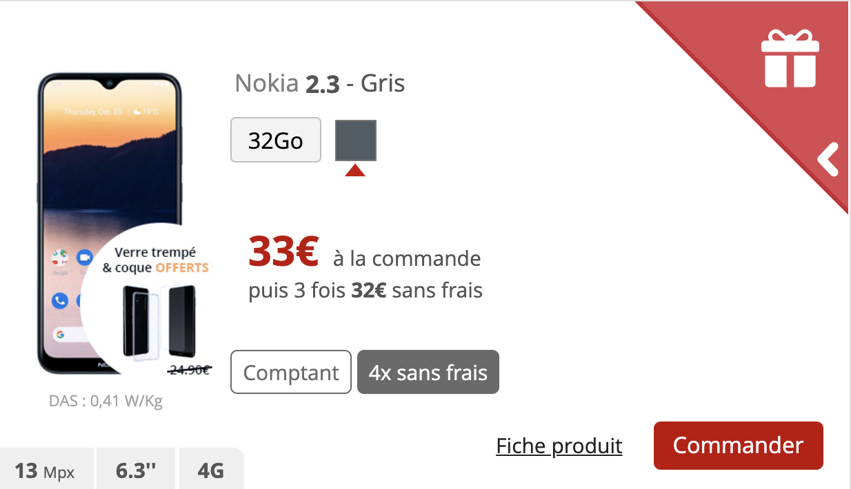 Pour tout achat de ce smartphone visant les petits budgets, un verre trempé et une coque d’une valeur de 24,90€, sont offerts. Le Nokia 2.3 est affiché à 129€ à la commande. Il est également possible de l’acheter en 4 fois sans frais, pour un premier versement de 33€ puis trois fois 32€ sans frais.