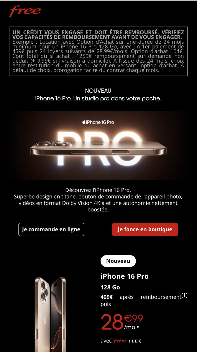 “Découvrez l’iPhone 16 Pro. Superbe design en titane, bouton de commande de l’appareil photo, vidéos en format Dolby Vision 4K à et une autonomie nettement boostée”, dans un nouveau courriel envoyé à ses abonnés, Free Mobile informe de a disponibilité du nouveau flagship d’Apple, dans ses boutiques physiques ou en ligne. L’opérateur met en avant la version 128 Go, proposée avec Free Flex. Il en coûtera un 409€ après remboursement puis 28,99€/mois pendant 24 mois, l’option d’achat est fixée ensuite à 104€.