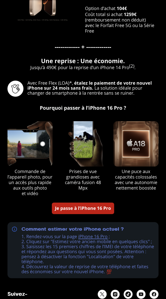 Dans ce mail, Free met également en avant une offre de reprise jusqu’à 490€ pour la reprise d’un iPhone 14 Pro 128Go en parfait état (20/09 au 30/09/2024). Via internet, le remboursement est effectué par virement sous 5 jours à compter de la confirmation de la valeur du mobile par Recommerce à réception du mobile. En boutique, la remise “est immédiate à hauteur du 1er paiement du mobile moins 1€ et remboursement du montant restant sous forme d’avoir sur facture.”