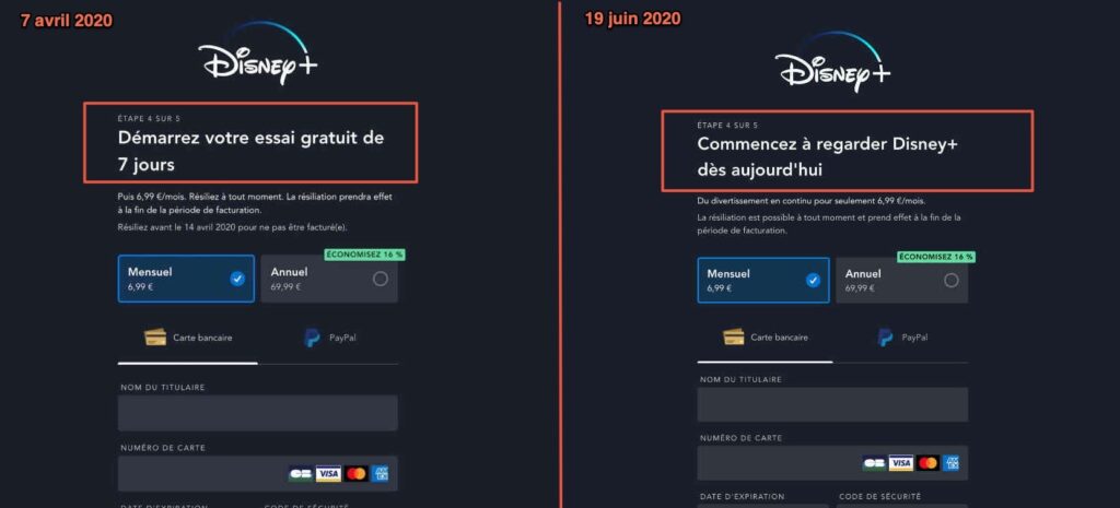 Un changement discret qui a été repéré par nos confrères de Numerama. Au lieu d’indiquer, comme c’était le cas depuis son lancement, “démarrez votre essai gratuit de 7 jours”, le site invite dorénavant à simplement commencer à regarder son contenu une fois inscrit.