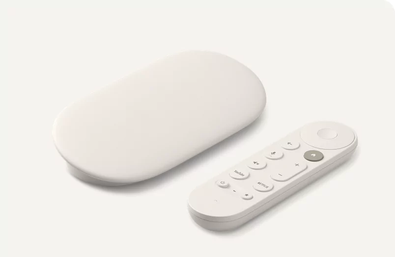 Côté design, le Google TV Streamer prend la forme d’un gros galet avec des lignes épurées et une couleur porcelaine, pour un poids d’un peu plus d’un kilogramme. Vous est également fournie une télécommande dotée d’un microphone pour un contrôle à la voix. A l’arrière on y trouve trois prises simples : un port ethernet, un port d’alimentation et une prise HDMI.