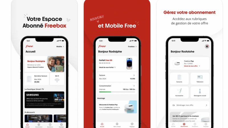 L’application Free permet de gérer facilement son abonnement et ses services depuis son smartphone. Pour les abonnés Freebox, il est notamment possible d’accéder au réglage des services, options TV, consulter et télécharger les factures et d’accéder à la messagerie vocale et à sa consommation téléphonique, ou encore de se rendre dans la boutique d’accessoires. L’accès au WiFi ou encore à la rubrique de déménagement et l’assistance Free Proxi est également proposé.