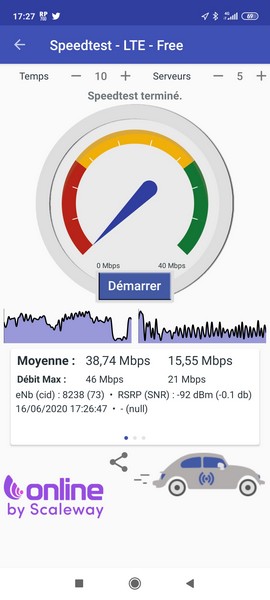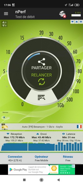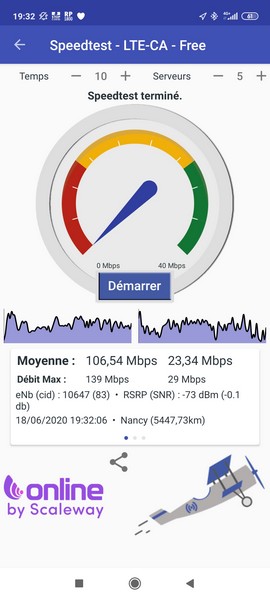 Le Redmi Note 9 Pro supporte la 4G 700 MHz (B28) utile pour aux abonnés Free Mobile. En zone bien couverte, il permet d’avoir d’assez bons débits en 4G, y compris en intérieur. Cela explique les téléchargements qui ne s’éternisent pas. Ci-dessous, des tests de débit en extérieur avec les outils de speedtest RNC Mobile et nPerf :