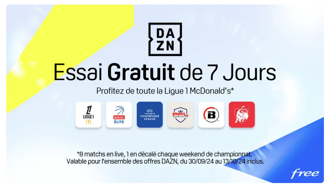 L’offre d’essai gratuit de 7 jours de DAZN est disponible jusqu’au 13 octobre. Free annonce la possibilité d’y souscrire directement depuis le canal 37 des Freebox.