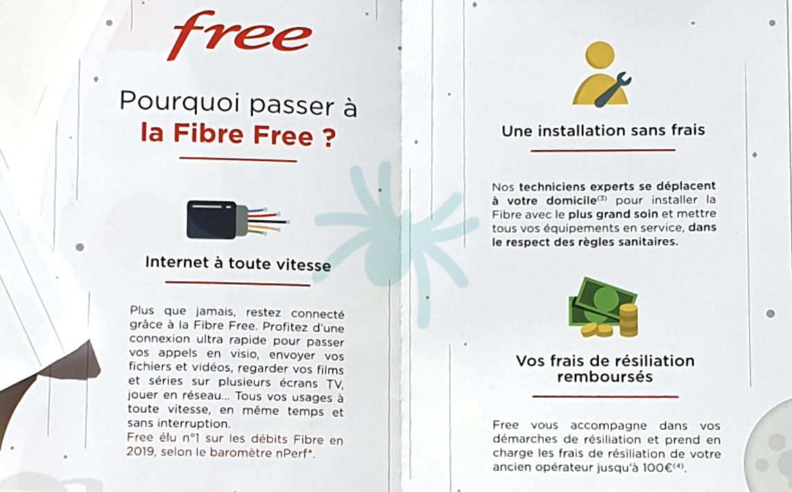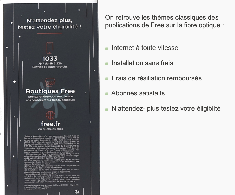 Au-delà des habituelles campagnes publicitaires dans le mobilier urbain pour mettre en avant la démocratisation de sa fibre, Free mise depuis plus près d’un an sur la publicité locale (sachets de pain et taxi) pour faire les yeux doux à la population et se montrer visible dans les zones où l’arrivée de ses offres fibre n’est pas forcément de notoriété publique. Dans cette optique, l’opérateur de Xavier Niel peaufine aujourd’hui son opération séduction, rapporte Busypider. Une brochure officielle et ludique expliquant “pourquoi passer à la fibre Free ?” est actuellement distribuée dans les zones fibrées au quatre coins du territoire. Y figurent notamment, les principales informations pour les futurs abonnés, comme le débit et “l’internet à toute vitesse” de l’opérateur, l’installation sans frais, les frais de résiliation remboursés, le niveau de satisfaction des abonnés mais aussi la démarche à suivre pour tester son éligibilité.