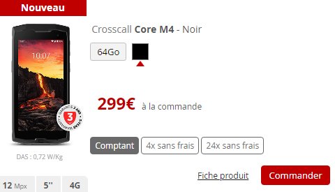 Il s’agit du Crosscall Core-M4 qui s’affiche à 299 euros en paiement au comptant. On peut également l’acquérir en 4x sans frais (77 euros à la commande, puis 3 fois 74 euros) ou 24x sans frais (107 euros à la commande, puis 24 fois 8 euros).