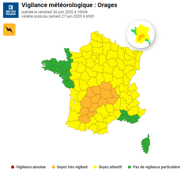 Attention orages ! Si vous habitez en Nouvelle Aquitaine ou en Auvergne-Rhône-Alpes vous pouvez être concernés par cette annonce. “Des orages se déclenchent à nouveau par le sud Aquitaine en fin de journée. D’abord peu virulents, ils s’organisent en progressant vers l’est Aquitaine, l’ouest Midi-Pyrénées le Limousin et l’Auvergne ce soir et la nuit prochaine” explique Météo France 13 départements ont ainsi été placés en alerte orange en raison des violents orages prévus, selon la carte de vigilance de Météo-France. L’alerte a été diffusée à 10h03 ce vendredi et est valable jusqu’à demain samedi à 16h00