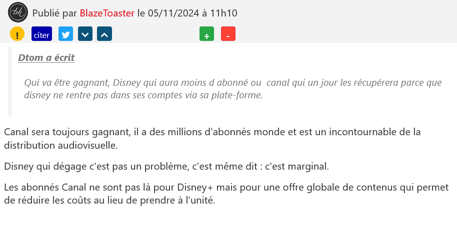 Comme un symbole, Disney a choisi le 4 novembre, jour de l’anniversaire des 40 ans de Canal+ pour annoncer la mauvaise nouvelle dans un communiqué : « À partir du 1er janvier 2025, les clients de Canal+ ne pourront plus regarder nos nouveaux films, ni accéder à Disney+ (plateforme de streaming intégrée à certaines offres, ndlr) ni à nos chaînes de télévision via leur abonnement ». L’ accord de distribution exclusif entre les deux groupes n’a donc pas été renouvelé, cette rupture affectera donc l’accès de des contenus de Disney via Canal+, mettant un terme à plusieurs années de collaboration fructueuse. “ C’est une consommation assez marginale de nos abonnés (…) On n’est pas à l’abri de se retrouver un jour” affirme Gérald-Brice Viret, mais des Freenautes se questionnent sur celui qui est le vrai gagnant dans l’histoire.