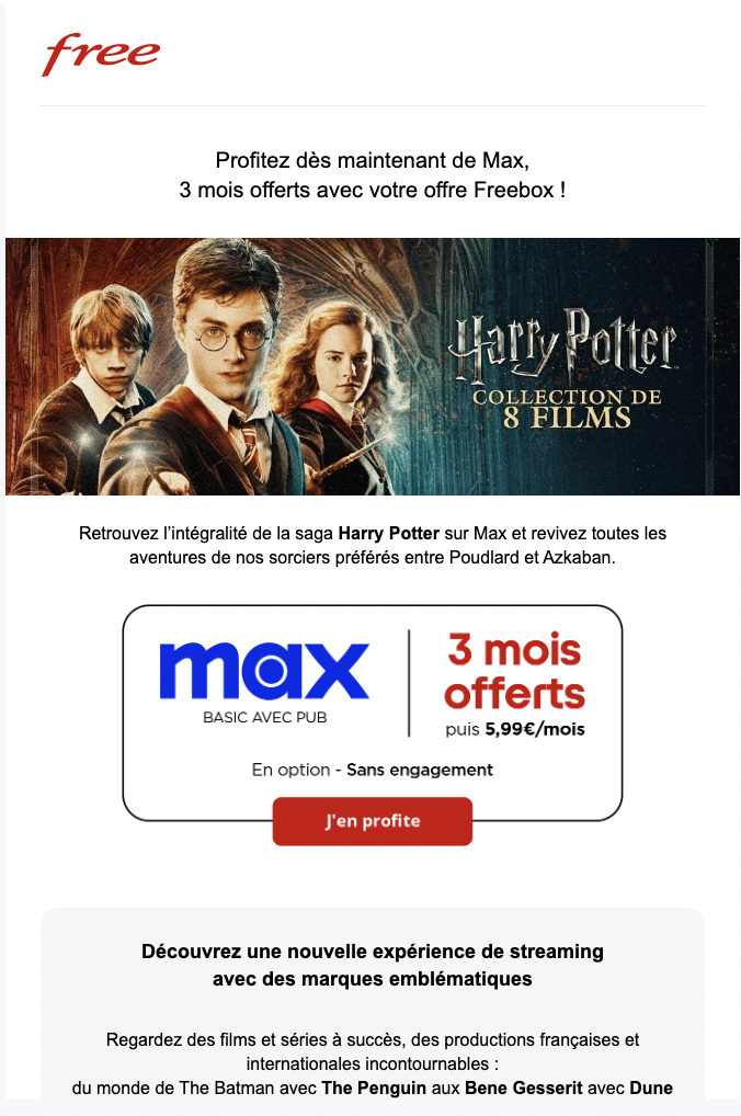 Des abonnés Freebox Révolution, Pop, mini 4K, Delta et Ultra disposent désormais de 2 mois à compter de la réception d’un nouveau courriel de Free pour profiter de la plateforme de streaming Max gratuitement pendant 1 mois ou 3 mois selon leur abonnement.
