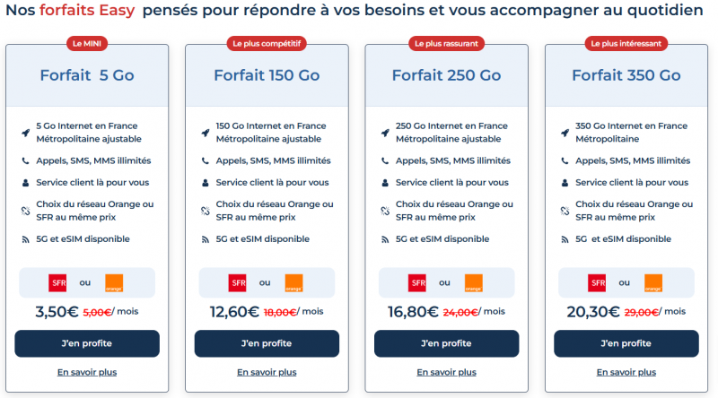 Et pour les data-addicts, le forfait 350 Go est proposé à 20,30 € (contre 29 € en temps normal). Le tout en 4G et avec la possibilité de choisir entre les réseaux Orange et SFR. Possibilité de bénéficier de la 5G en payant 5 € supplémentaire chaque mois.