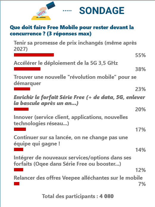 Face à une concurrence féroce dans le secteur des télécommunications, Free Mobile continue de séduire les abonnés grâce à son positionnement tarifaire, son forfait 5G riche en data et destinations mais aussi grâce aux avantages Freebox. Mais que doit faire le premier recruteur sur le segment depuis 2022 pour tenir la dragée haute à Bouygues Telecom, Orange et SFR dans les années à venir ? Notre dernier sondage mené auprès de 4 080 participants révèle les priorités des utilisateurs.
