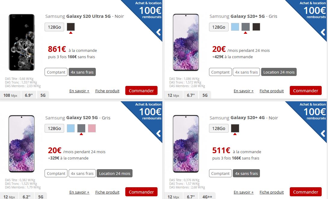 - Galaxy S20+ 5G : comptant à 1 109 euros, 4x sans frais (611 euros à la commande, puis 3x 166 euros) ou location 24 mois (429 euros à la commande, puis 20 euros par mois pendant 24 mois)