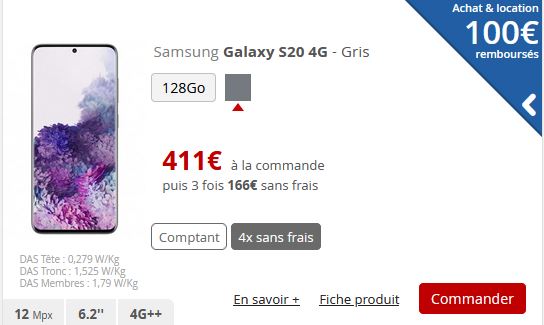 - Galaxy S20 4G : comptant à 909 euros ou 4x sans frais (411 euros à la commande, puis 3x 166 euros)