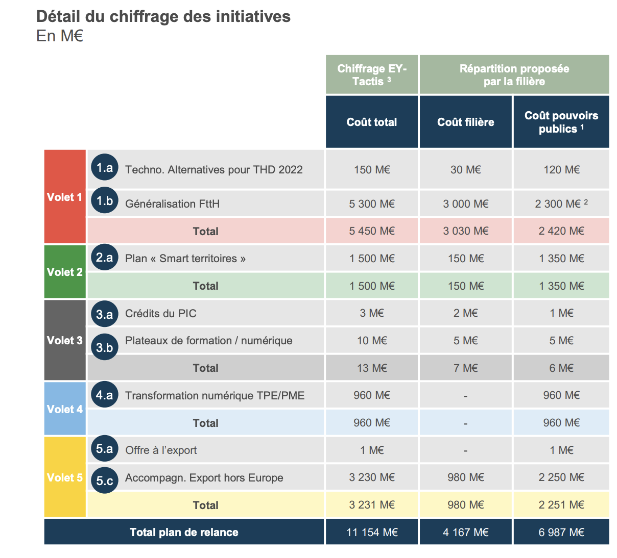 Coût total des mesures demandées, 11,2 milliards d’euros pour une prise en charge de 7 milliards d’euros par l’Etat, les collectivités et fonds européens. A y regarder de plus près, la généralisation de la fibre à savoir 97% de la population couverte en 2025, nécessiterait à elle seule un investissement de 5,3 milliards d’euros. Le coût pour la filière serait à alors de 3 milliards d’euros, le reste serait alors à la charge des pouvoirs publics.