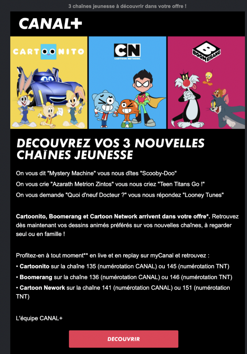 Après avoir annoncé le 15 novembre, le renouvellement de son accord de distribution des chaînes Eurosport pour ses abonnés en France, mais aussi un renforcement de son partenariat avec le groupe Warner Bros. Discovery avec l’arrivée prochaine de Boomerang, Cartoon Network et Cartoonito, Canal+ ne perd pas de temps. La filiale de Vivendi envoie actuellement un mail à des abonnés pour leur annoncer l’intégration de ces 3 chaînes dans leur offre. Deux d’entre elles (Boomerang, Cartoon Network) marquent leur retour après un retrait en janvier 2023, les négociations commerciales n’aient alors pas abouti.