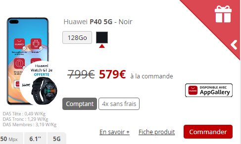 Le Huawei P40 5G est ainsi proposé à 579 euros au comptant au lieu de 799 euros. Il peut également être acquis en 4x sans frais (147 euros à la commande, puis 3x 144 euros).