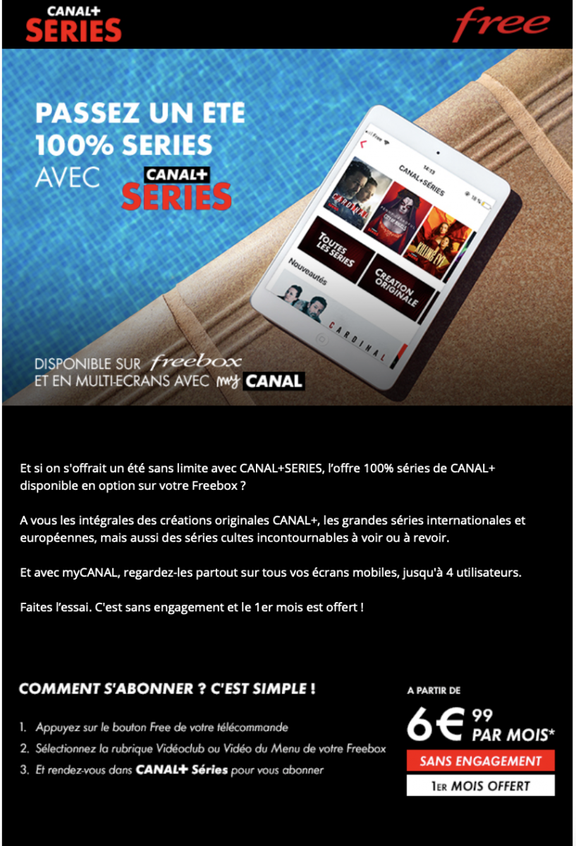 Le saviez-vous ? Canal Séries est accessible sans engagement sur les Freebox avec le premier mois d’offert. Pour ceux qui l’aurait oublié, Canal + le rappelle dans un mail estival !