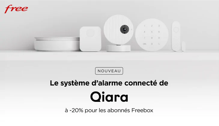 En mars dernier, Free et Qiara lançaient un système d’alarme spécialement conçu pour les Freebox. Cette offre inclut le “Pack Essentiel”, composé d’une caméra intelligente, d’un détecteur de mouvement, d’un détecteur d’ouverture, d’une sirène et d’un clavier, proposé à 199 € au lieu de 249 € pour les abonnés Freebox. Il est également possible de souscrire à une offre de télésurveillance 24/7.