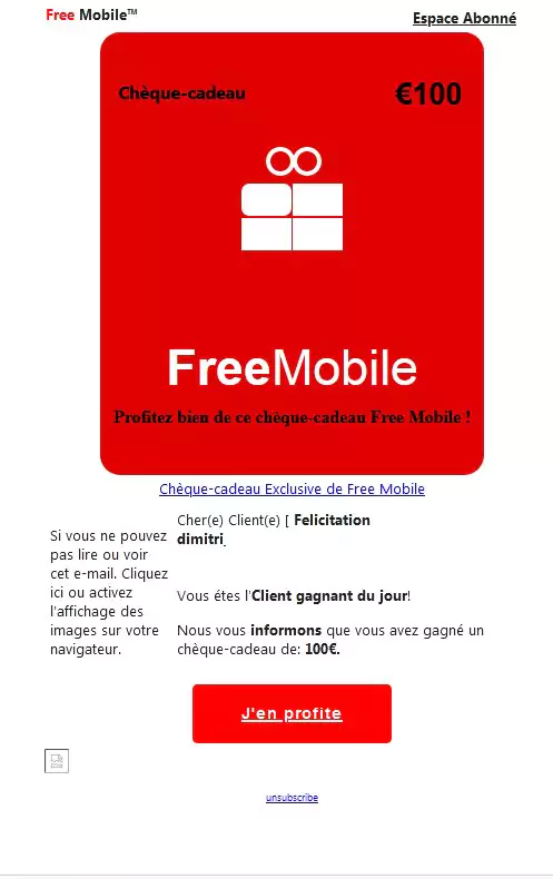 Et pour ceux qui ouvriront tout de même l’e-mail, par curiosité ou par mégarde, voici ce qu’ils découvriront : un logo inventé (alors qu’on le récupère assez facilement sur Internet), une mise en page bâclée et un français plus que bancal (“Chèque-cadeau Exclusive de Free Mobile”, “Vous étes l’Client gagnant du jour”…). Oui, on peut le dire, ça pique les yeux, aussi bien à regarder qu’à lire.