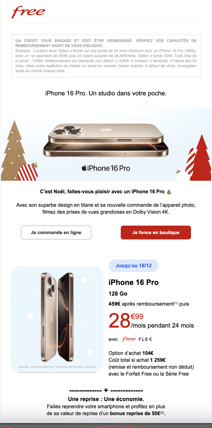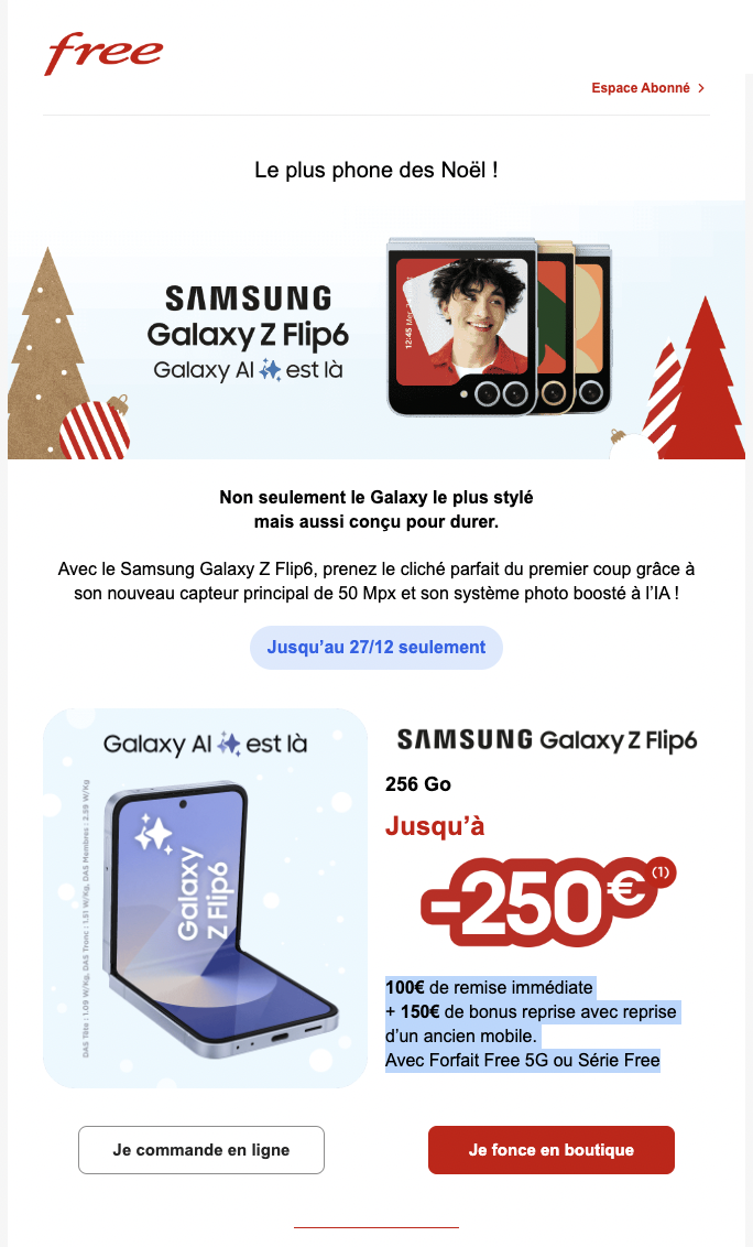 A l’approche de Noël, Free Mobile propose de nouvelles promotions sur une série de smartphones haut de gamme dans sa boutique. Pour ses abonnés qui ont accepté de recevoir des informations commerciales de sa part, l’opérateur envoie actuellement des emails afin de leur proposer ses meilleures offres du moment. Un courriel fait la promotion l’iPhone 16 Pro : “Profitez de jusqu’à -100€ en plus de la valeur de reprise de votre mobile”, annonce-t-il. Le Samsung Galaxy Z Flip6 est également mis en avant dans un second mail : “100€ de remise immédiate + 150€ de bonus reprise avec reprise d’un ancien mobile avec Forfait Free 5G ou Série Free”, propose ainsi l’opérateur jusqu’au 27 décembre.