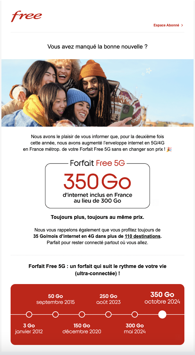 “Nous avons le plaisir de vous informer que, pour la deuxième fois cette année, nous avons augmenté l’enveloppe internet en 5G/4G en France métropolitaine de votre Forfait Free 5G sans en changer son prix”, indique l’opérateur. L’enveloppe de data est ainsi passée de 300 à 350 Go. L’opérateur en profite pour rappeler à ses abonnés qu’ils bénéficient toujours de 35 Go/mois d’internet en 4G dans plus de 110 destinations.