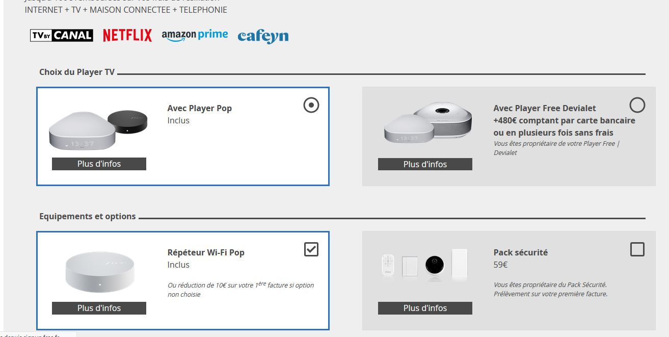 Sans changer de Server et ainsi en bénéficiant toujours des 10 Gbit/s en fibre, vous pourrez ainsi profiter de la nouvelle interface OQEE de Free, mais aussi utiliser le répéteur WiFi intelligent lancé avec le nouveau bébé de Xavier Niel. Il est possible de personnaliser son offre,et donc de se passer du répéteur. Si il ne vous intéresse pas, 10 € seront déduits de vos frais d’installation. Le player Free-Devialet est bien sûr toujours disponible à l’achat.