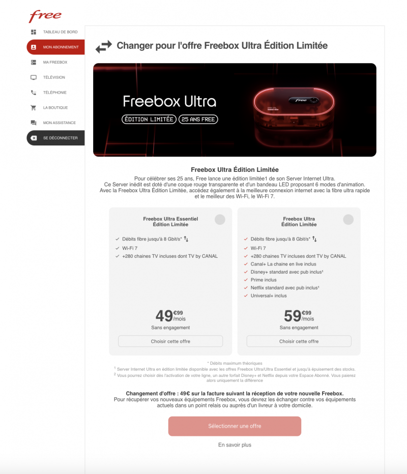 En se rendant dans l’espace abonné, dans la rubrique “Mon Abonnement” puis “Changer pour l’offre Freebox Ultra Edition Limitée”, les abonnés peuvent migrer au choix vers la formule Essentiel à 49,99€/mois ou la Freebox Ultra avec son armada de services inclus à 59,99€/mois. Les frais de migration s’élèvent à 49 euros.