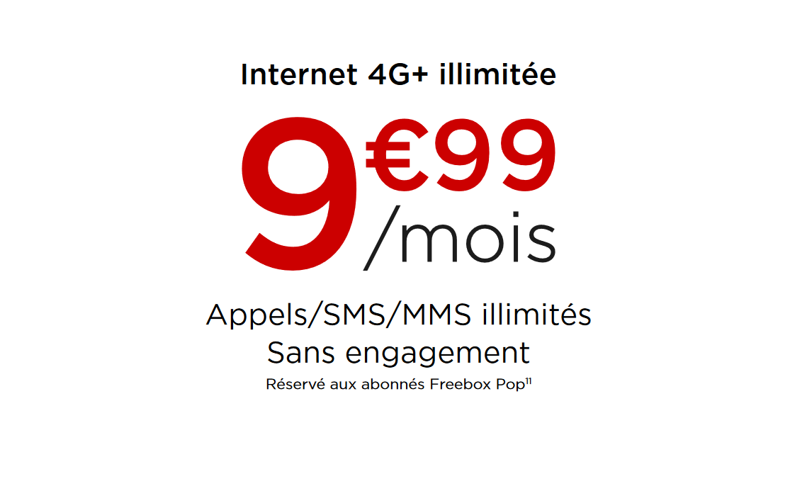 Il en reste un peu, Free vous en remet ? Les abonnés Free Mobile optant pour la nouvelle box de Free peuvent bénéficier d’une réduction de 10€ sur leur forfait Free. Ainsi, avec la Freebox Pop, vous bénéficiez d’un forfait 4G illimité pour 9.99€ par mois.