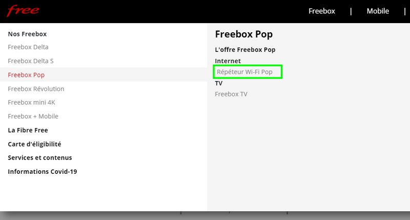 Pour trouver l’outil en ligne, il faut accéder à la section du site Free dédiée aux offres Freebox. De là, ouvrez le menu, sélectionnez votre box et cliquez sur “Répéteur Wi-Fi Pop”.