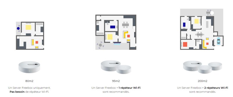 Pour plus de 180 m² et plus de 3 niveaux, Free recommande par exemple 3 répéteurs Wi-Fi Pop.