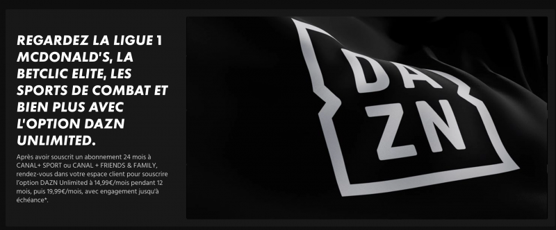Canal+ permet à certains abonnés de s’abonner à DAZN pour accéder à la Ligue 1 à à 14,99€/mois pendant un an, puis 19,99€/mois avec un engagement sur la durée du contrat principal.