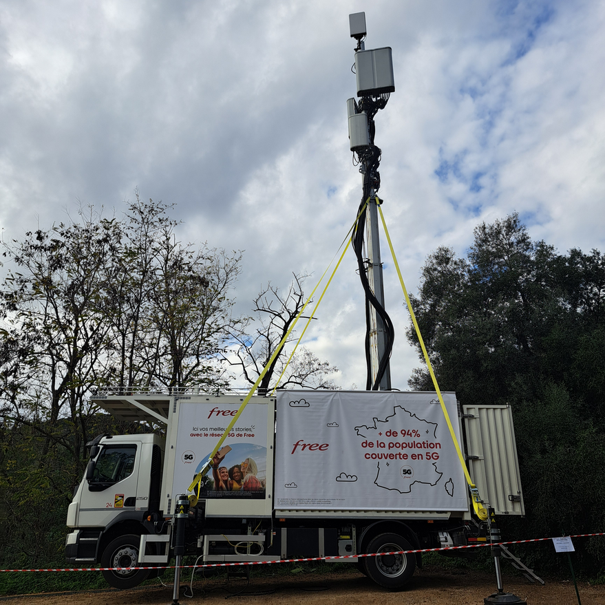 Free annonce ainsi avoir déployé l’un de ses camions provisoires équipés d’une antenne-relais à proximité. Ce dernier est alimenté par une fibre optique de 10 Gb/s et permet une connectivité en 3G, 4G mais aussi 5G.
