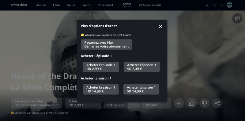 Les abonnés Prime peuvent à présent retrouver à l’achat les épisodes (2,99€ en HD) et des saisons (14,99€) de séries comme House of the Dragon diffusée sur Max ou La Servante Ecarlate à l’affiche sur Ciné+ OCS. Cette évolution permet ainsi d’accéder à des séries de certaines plateformes sans devoir s’abonner directement à celles-ci. Des nouveautés sont également à venir : Dune : Prophecy, actuellement diffusée sur Max, sera accessible à l’achat à partir du 8 janvier sur Prime Video, rapporte CNET France.