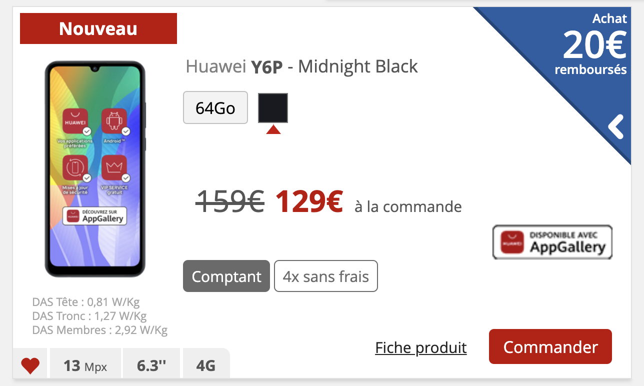 Une batterie importante de 5000 mAh, un triple capteur photo, Android 10 mais sans le store d’application de Google (AppGallery à la place) et une compatibilité 700 MHz, le Huawei Y6p pourrait tenter les prix budgets chez Free Mobile. Pour son arrivée dans la boutique en ligne, Free Mobile le propose à l’achat à 129€ au lieu de 159€, soit 30€ de réduction. Et ce n’est pas tout, puisqu’une ODR (offre de remboursement) de 20€ jusqu’au 27 septembre est également proposée en sus. Pour en profiter, il est nécessaire de faire la demande une fois le smartphone acheté. Au final, le Huawei Y6p est accessible à 109€. Ce smartphone d’entrée de gamme est également disponible en 4 fois sans frais.