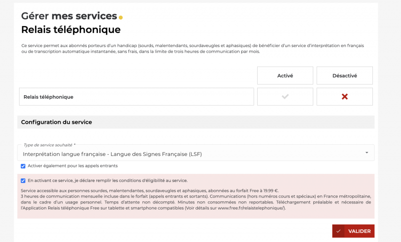 Si votre abonnement permet de bénéficier du service relais téléphonique, afin de pouvoir l’utiliser, il suffit de vous rendre dans votre Espace Abonné afin d’activer le service en fonction de la ligne pour laquelle vous souhaitez utiliser le service dans la Rubrique “Téléphonie” pour les abonnés Freebox et dans “Mon Forfait Mobile” puis “Mes services” pour les clients mobiles.