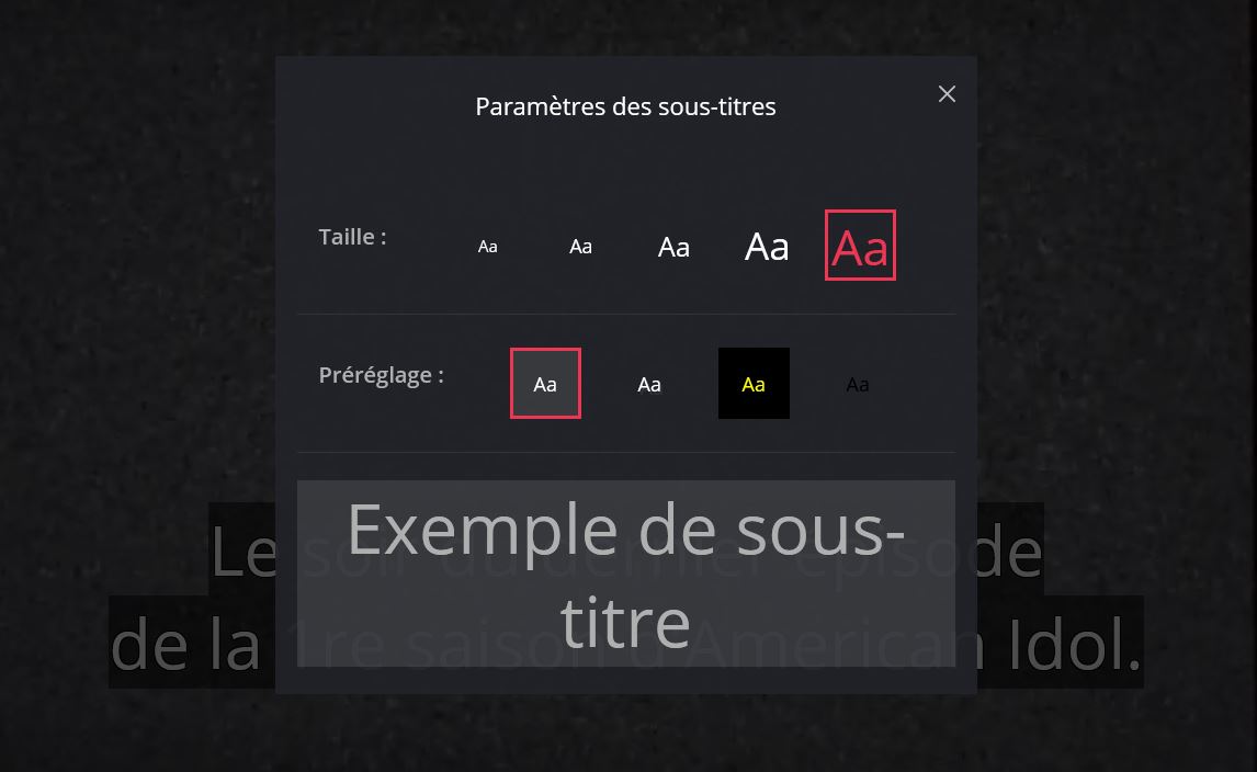 Pour y accéder, il suffit de cliquer sur le lecteur de votre contenu (à la demande et VOD uniquement, la fonctionnalité n’étant pas active pour les chaînes en direct), puis sur le bouton présentant une simple bulle. Ensuite, cliquez sur les paramètres de sous-titres et réglez vos préférences. Un aperçu est proposé et s’adapte à chacune de vos modifications.