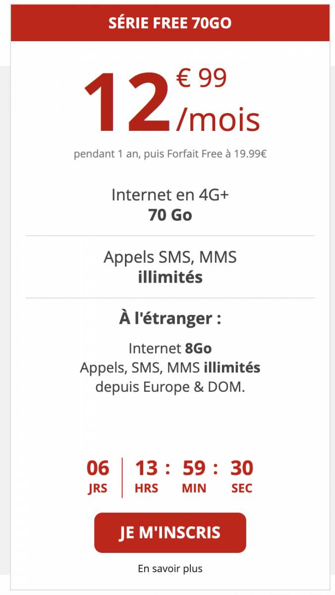 Pendant une semaine, Free Mobile propose son forfait “Série Free” avec 70 Go à 12,99€/mois pendant un an, soit deux euros de plus qu’une précédente offre proposée fin juin.