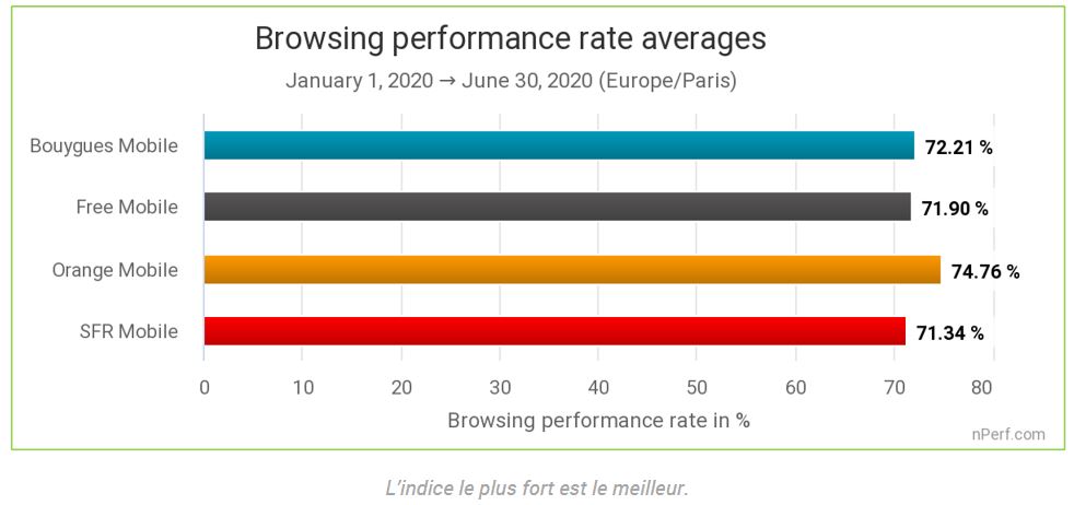Si Orange est toujours en tête (51.85 Mb/s), Free quant à lui reste loin devant ses concurrents Bouygues et SFR, avec un débit descendant moyen de 44.67 Mb/s au cours du premier semestre 2020.