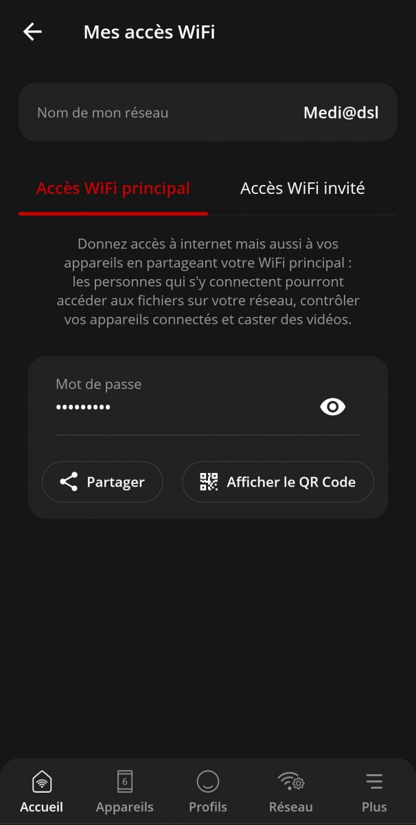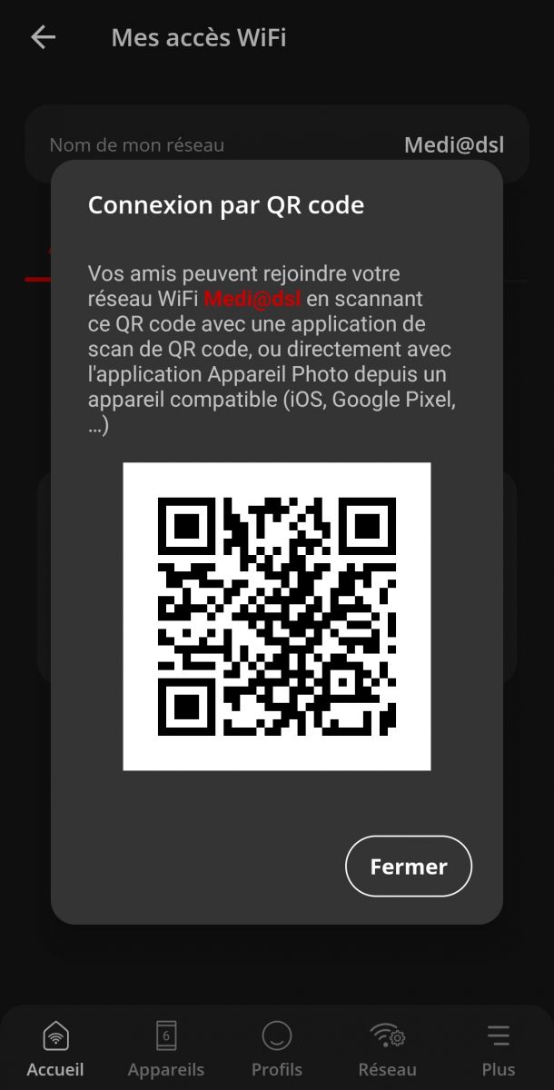 La seconde quant à elle vise à pouvoir partager facilement son Wi-Fi. Vous pouvez ainsi partager directement votre mot de passe Wi-Fi par message, mail ou autre application de communication, ou générer un QR Code que votre ami pourra scanner. C’est également ici que vous pourrez créer un accès invité.
